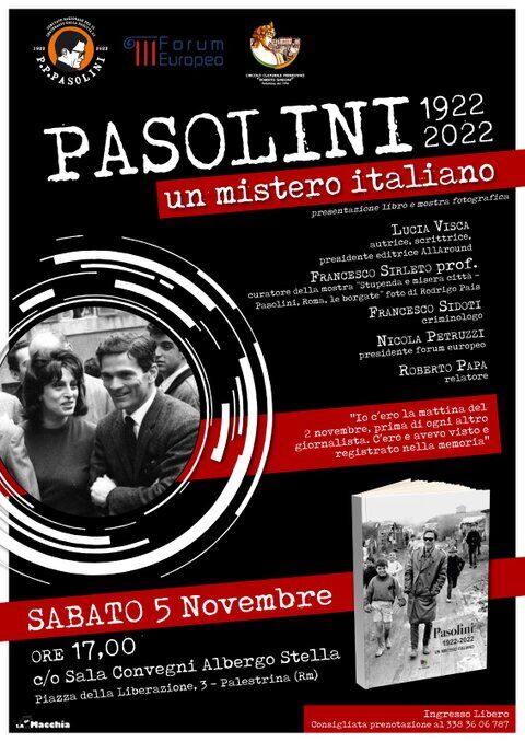 Il 5 novembre alle ore 17:00 presso la sala convegni Albergo Stella, piazza della Liberazione 3 a Palestrina (RM), l’evento organizzato dall’associazione “Circolo culturale prenestino Roberto Simeoni” nel quale è stato presentato il libro di Lucia Visca "PASOLINI 1922-2022. UN MISTERO ITALIANO" ed inaugurazione della mostra fotografica “STUPENDA E MISERA CITTA’. PASOLINI, ROMA, LE BORGATE”, nelle fotografie di Rodrigo Pais..